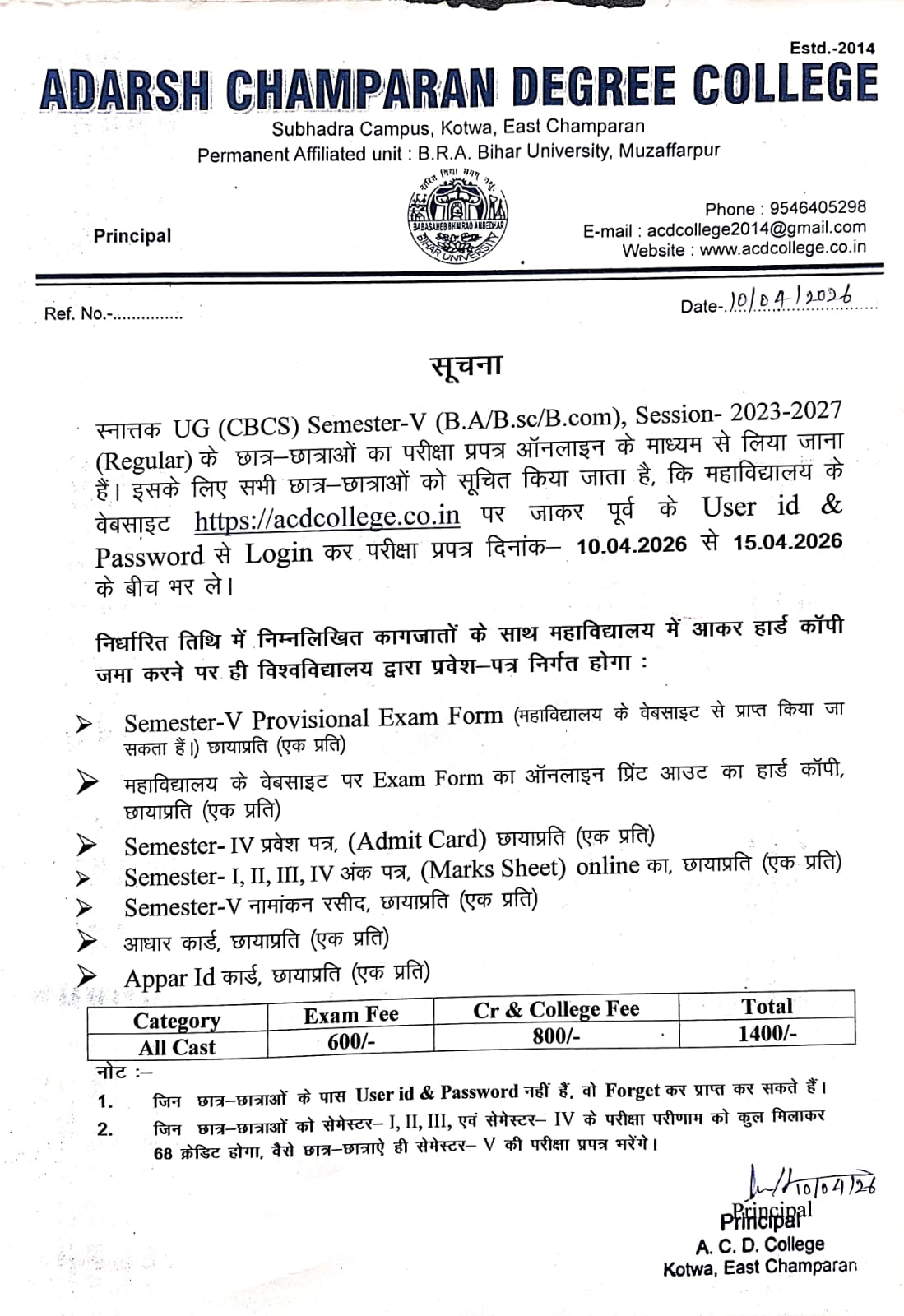 'Examination Notice Semester-V(2025-2029)'ADARSH CHAMPARAN DEGREE COLLEGE, KOTWA is located in Kotwa, heart of East Champaran a district in Tirhut Commisionary.This college is permanently Affiliated with Baba Saheb Bhim Rao Ambedkar University, Muzaffarpur, in Arts, Science, Commerce in Bachelor degree. Here is an oppertunity to learn from well qualified and experienced teachers. We have provision for N.S.S. career counselling and Remedial Classes time to time. This college always helping students for their development in all field.
