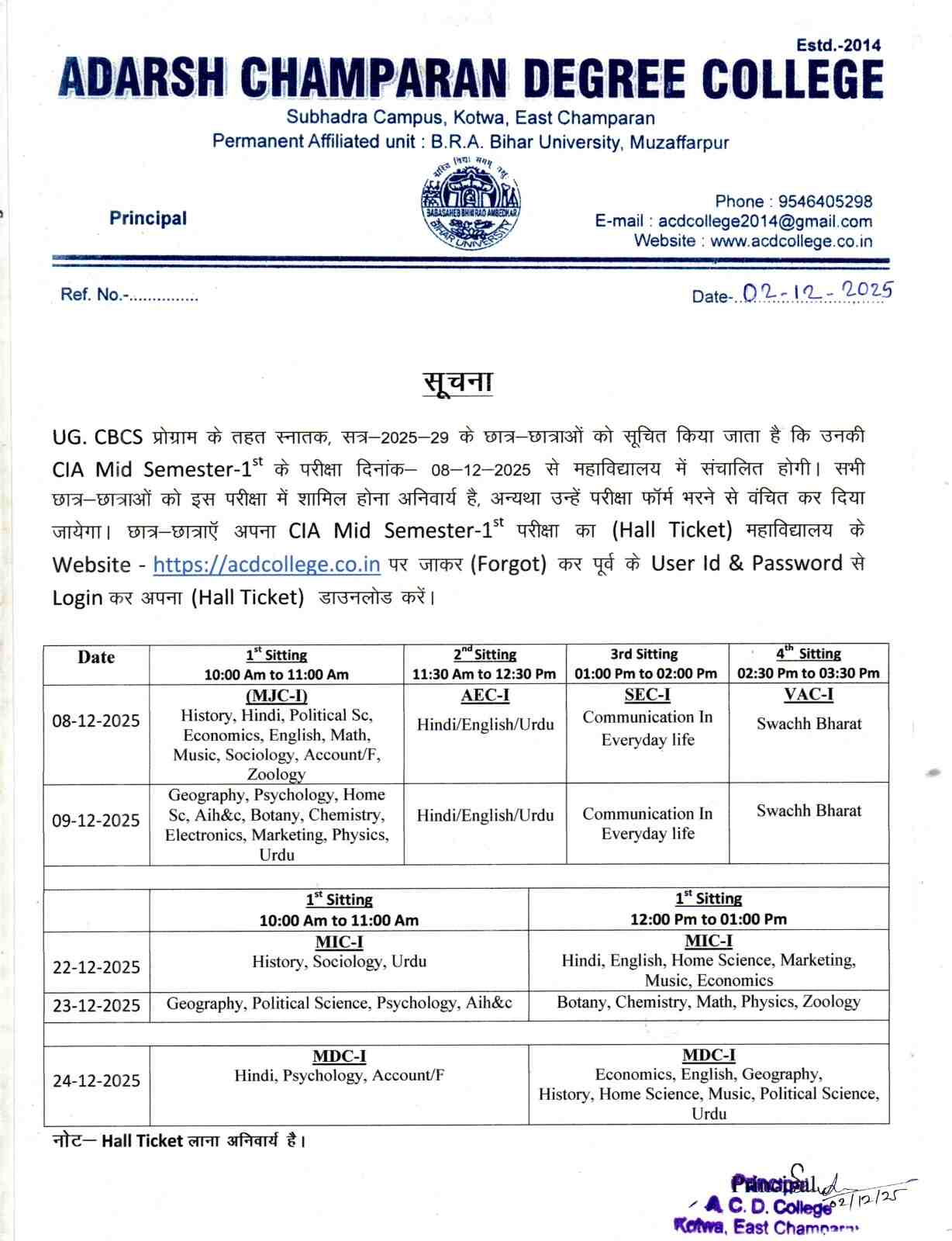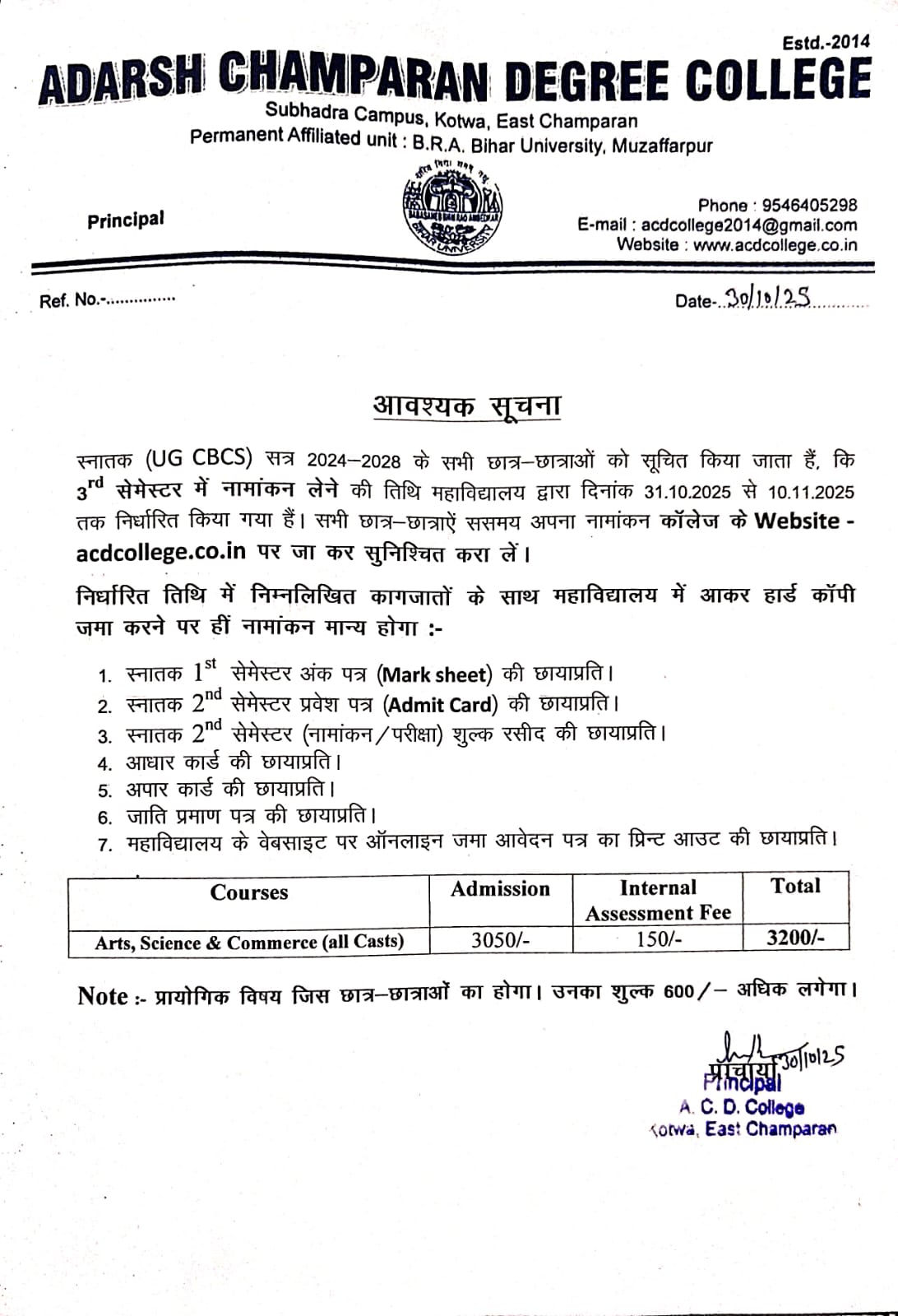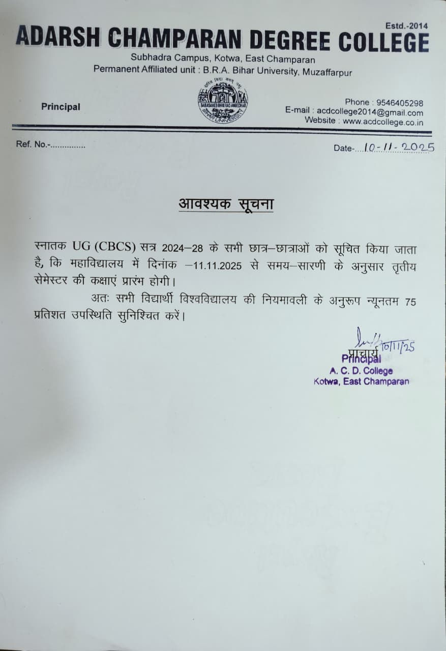 'Class Notice_Sem_II_2024-2028'ADARSH CHAMPARAN DEGREE COLLEGE, KOTWA is located in Kotwa, heart of East Champaran a district in Tirhut Commisionary.This college is permanently Affiliated with Baba Saheb Bhim Rao Ambedkar University, Muzaffarpur, in Arts, Science, Commerce in Bachelor degree. Here is an oppertunity to learn from well qualified and experienced teachers. We have provision for N.S.S. career counselling and Remedial Classes time to time. This college always helping students for their development in all field.